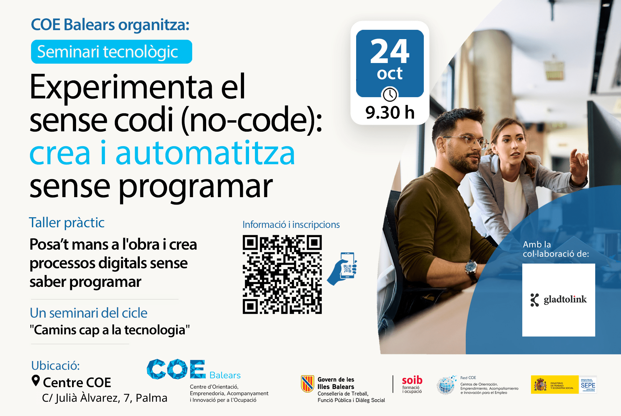 De la mà de Gladtolink, empresa tecnològica de Palma creadora de la seva pròpia eina sense codi (no-code), coneixerem com funciona aquesta tecnologia i aprendrem a configurar, pas a pas, un cas pràctic i senzill.